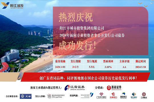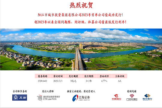 陽(yáng)江市城市投資集團(tuán)有限公司成立于2004年,是一家致力于推動(dòng)陽(yáng)江城市高質(zhì)量發(fā)展的國(guó)有企業(yè),目前陽(yáng)江市國(guó)資委占股90%,廣東省財(cái)政廳占股10%。公司經(jīng)營(yíng)范圍:城市基礎(chǔ)設(shè)施和工業(yè)園區(qū)基礎(chǔ)設(shè)施項(xiàng)目投資建設(shè),公用事業(yè)和社會(huì)公益性項(xiàng)目投資建設(shè),土地整理,資產(chǎn)管理和營(yíng)運(yùn),股權(quán)管理和營(yíng)運(yùn),投資經(jīng)營(yíng),投資收益的管理及再投資,財(cái)務(wù)咨詢(xún),工程咨詢(xún),國(guó)內(nèi)貿(mào)易,投資教育業(yè),市政府國(guó)有資產(chǎn)管理部門(mén)所授權(quán)的其他業(yè)務(wù)。陽(yáng)江城投集團(tuán)圍繞“城市發(fā)展命運(yùn)共同體”定位,積極主動(dòng)融入陽(yáng)江市發(fā)展大局,將以“服務(wù)陽(yáng)江、發(fā)展陽(yáng)江,創(chuàng)新引領(lǐng)”為使命,不斷夯實(shí)主業(yè)發(fā)展基礎(chǔ),培養(yǎng)產(chǎn)業(yè)競(jìng)爭(zhēng)能力。立足陽(yáng)江,面向大灣區(qū),全力打造區(qū)域發(fā)展與產(chǎn)業(yè)引領(lǐng)的產(chǎn)城服務(wù)商。